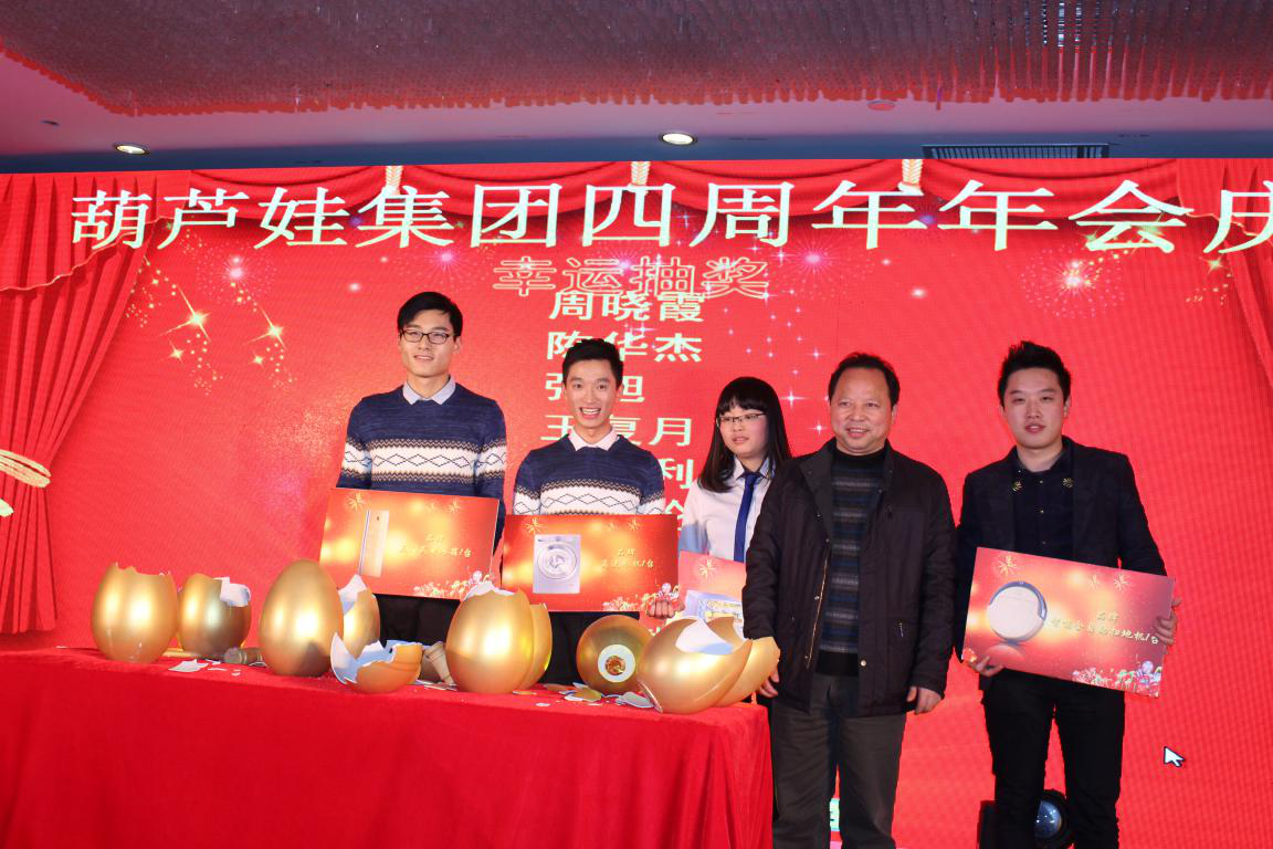 回首四年葫蘆娃取得的成績,我們倍感珍惜。這些成績的取得,凝聚了各級(jí)領(lǐng)導(dǎo)的深切關(guān)懷,凝聚了各界朋友的大力支持,凝聚了合作伙伴的精誠合作,凝聚了全體葫蘆娃人的不懈奮斗!晚會(huì)正式開始前,宴會(huì)廳LED屏幕上播放著精心制作的葫蘆娃集團(tuán)員工拜年視頻。2015年對葫蘆娃來說是極不平凡的一年,經(jīng)過全體葫蘆娃人日日夜夜的共同拼搏,除杭州總部的浙江葫蘆娃以外,我們成立了江西葫蘆娃網(wǎng)絡(luò)技術(shù)有限公司,江西葫蘆娃電子商務(wù)有限公司,北京葫蘆娃會(huì)務(wù)有限公司!實(shí)現(xiàn)了在認(rèn)證、電商、會(huì)務(wù)三個(gè)領(lǐng)域的全面發(fā)展。在互聯(lián)網(wǎng)認(rèn)證領(lǐng)域,葫蘆娃已經(jīng)是中國互聯(lián)網(wǎng)認(rèn)證行業(yè)龍頭企業(yè);在電商領(lǐng)域,葫蘆娃成為中國電子商務(wù)服務(wù)行業(yè)十佳企業(yè),并開拓了一個(gè)全新的輻射全國的電商人才認(rèn)證平臺(tái);在會(huì)務(wù)領(lǐng)域,我們與北京中國國展,與廣州廣交會(huì)簽訂了戰(zhàn)略合作協(xié)議!同時(shí),在江西玉山高鐵電商園,葫蘆娃大廈實(shí)現(xiàn)封頂!視頻中講述了葫蘆娃集團(tuán)2015年的發(fā)展,展現(xiàn)了葫蘆娃集團(tuán)的辦公環(huán)境、葫蘆娃大廈、各部門的員工風(fēng)采,匯聚了大家對葫蘆娃集團(tuán)2016年的期待和祝福。